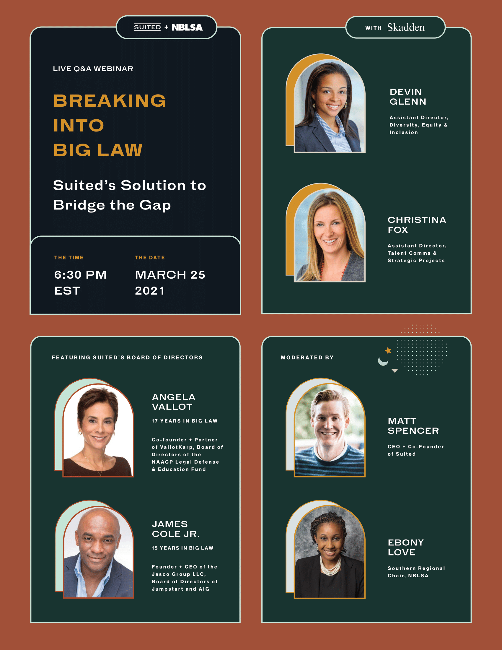 The event was moderated by Suited's CEO and Co-founder Matt Spencer and NBLSA's National Director of Career & Professional Development, Jaylen Amaker (who filled in for Ebony Love). Suited was represented by its two board members, Angela Vallot and James Cole Jr., with 17 and 15 years in the legal profession, respectively. Skadden, a firm on the Suited platform, was represented by Devin Glenn, the Assistant Director of Diversity, Equity, and Inclusion and Christina Fox, the Assistant Director of Talent Communication and Strategic Projects.